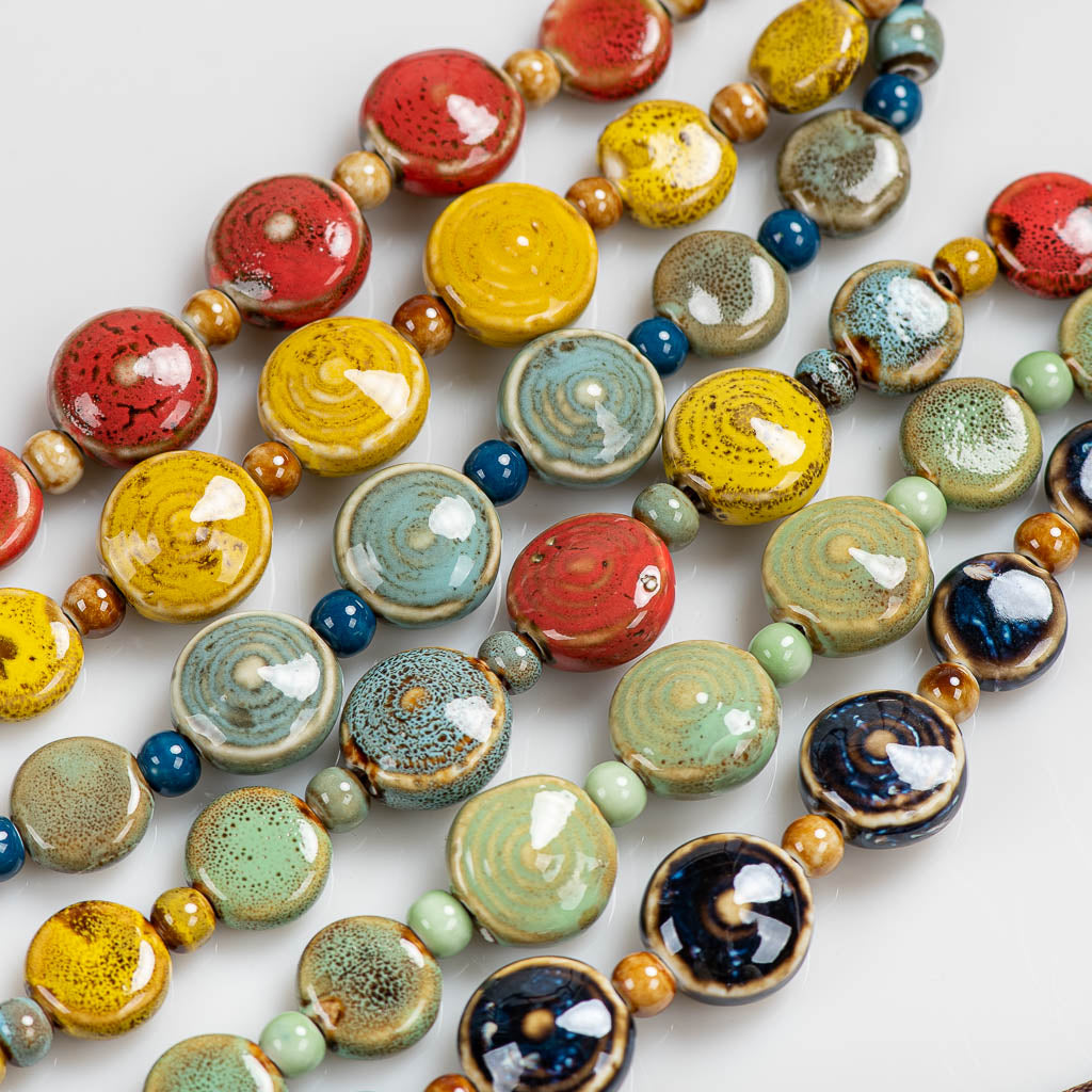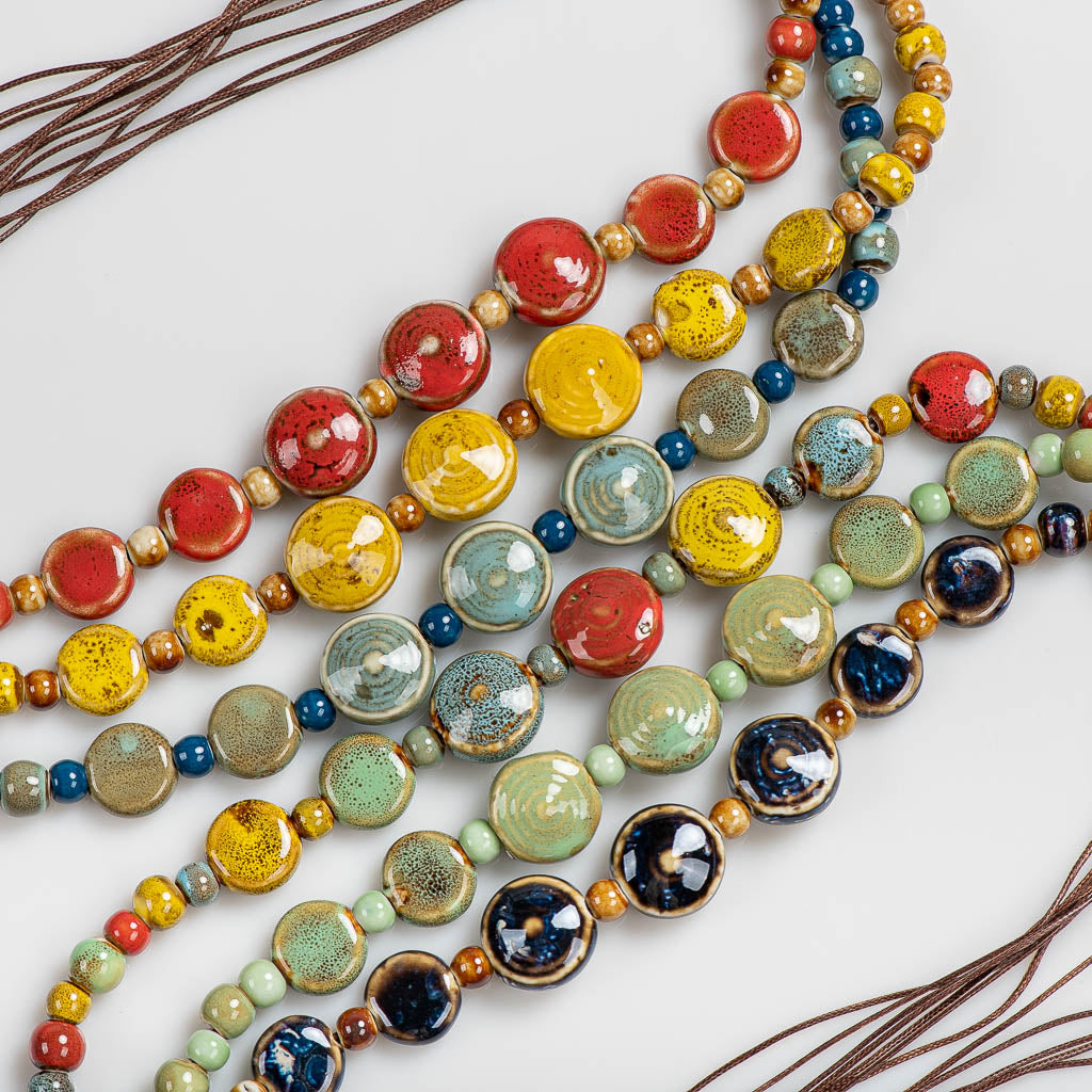 Feito com contas de cerâmica de alta temperatura e acabamento esmaltado, cada peça é única, com variações sutis de textura e cor que tornam o colar uma verdadeira obra de arte portátil. O cordão ajustável com acabamento artesanal em nós oferece praticidade e charme rústico, permitindo que você personalize o comprimento conforme o look do dia.