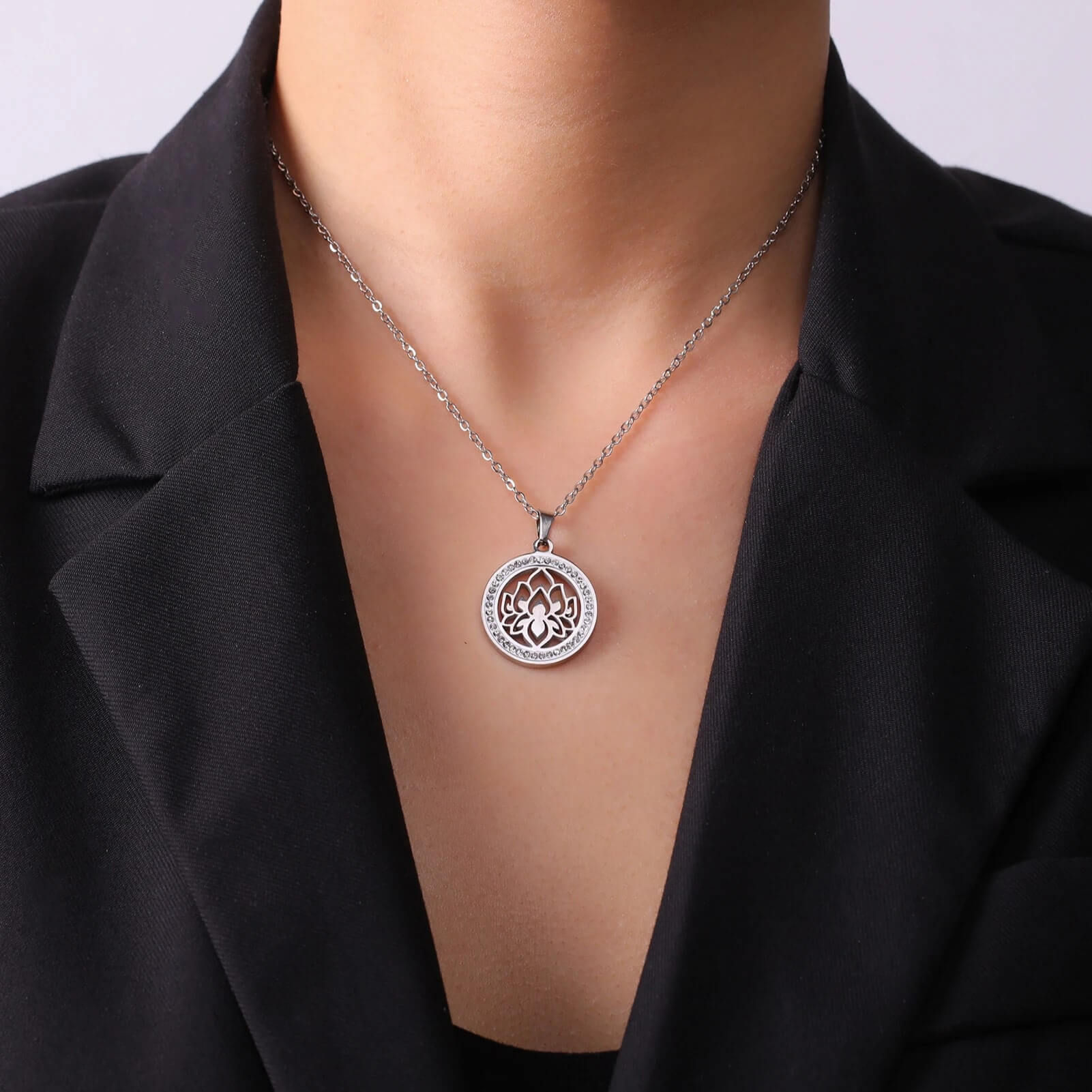 A flor de lótus, destacada no colar, simboliza pureza, iluminação e renascimento, qualidades que se refletem na vida de quem a usa.