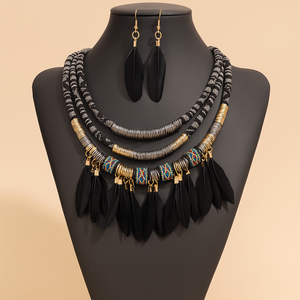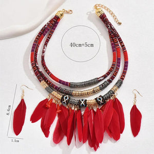 Cada peça é cuidadosamente montada para refletir a alma boêmia com um toque artesanal. O colar triplo cria um efeito visual impactante, mesclando tons de vermelho, preto, dourado e roxo em um design envolvente. As penas longas e leves adicionam movimento e fluidez, enquanto os brincos pendentes completam o visual com equilíbrio e charme étnico.