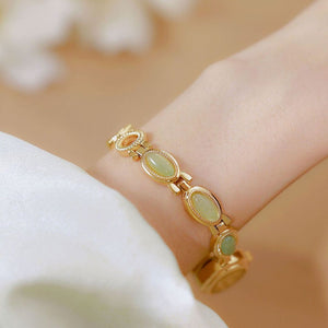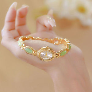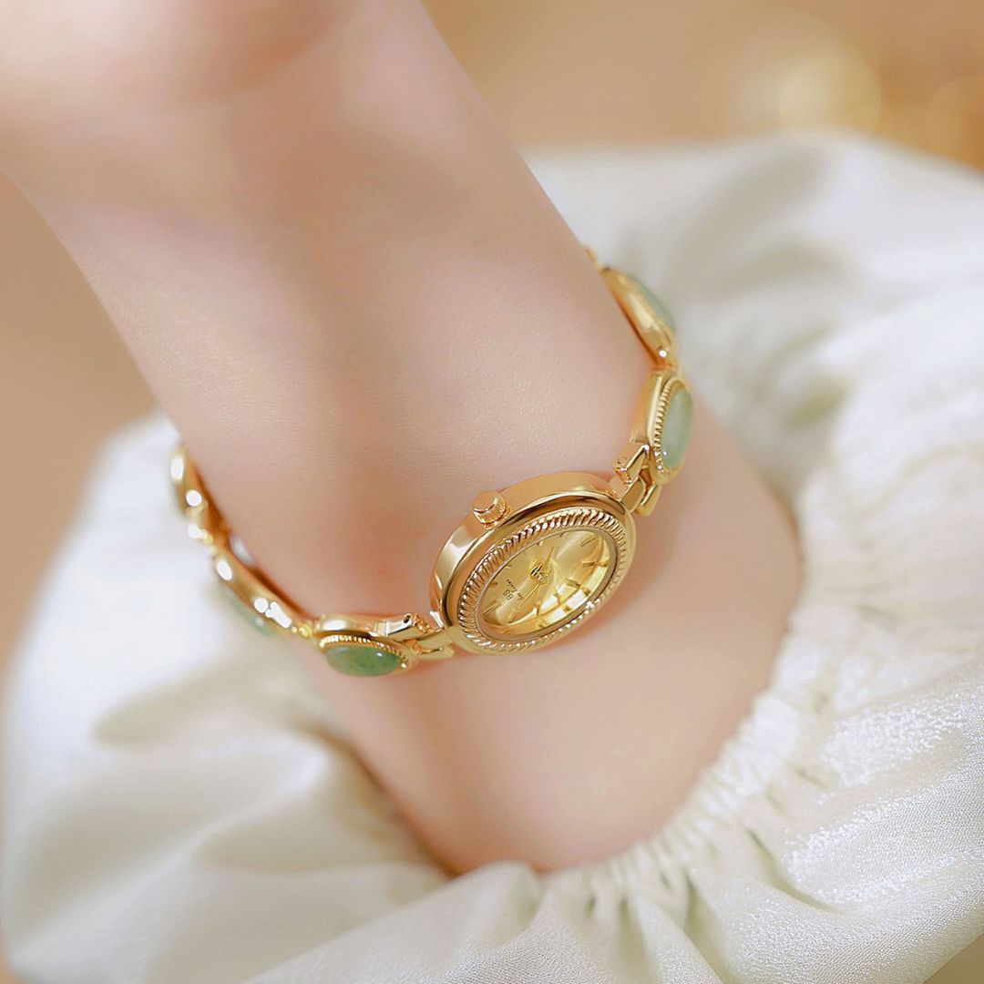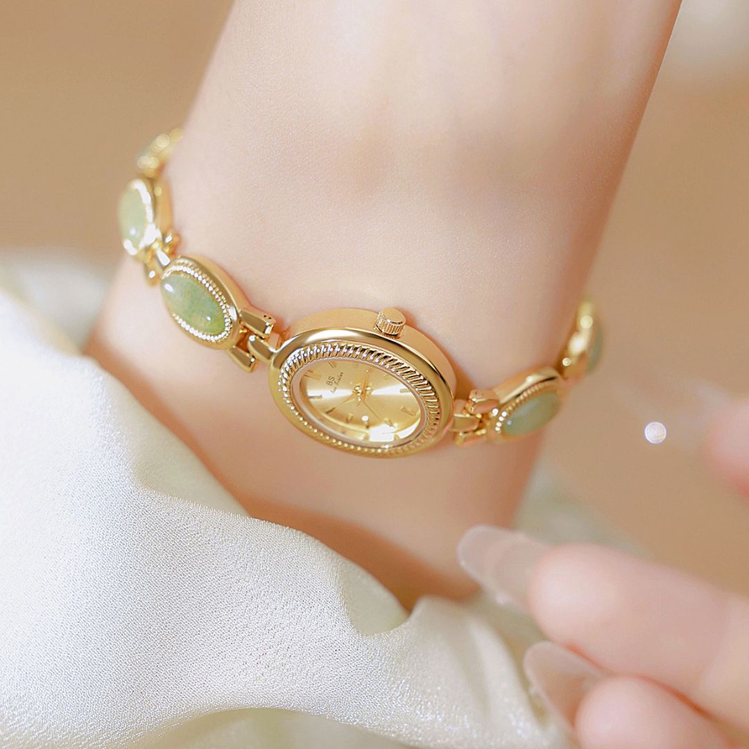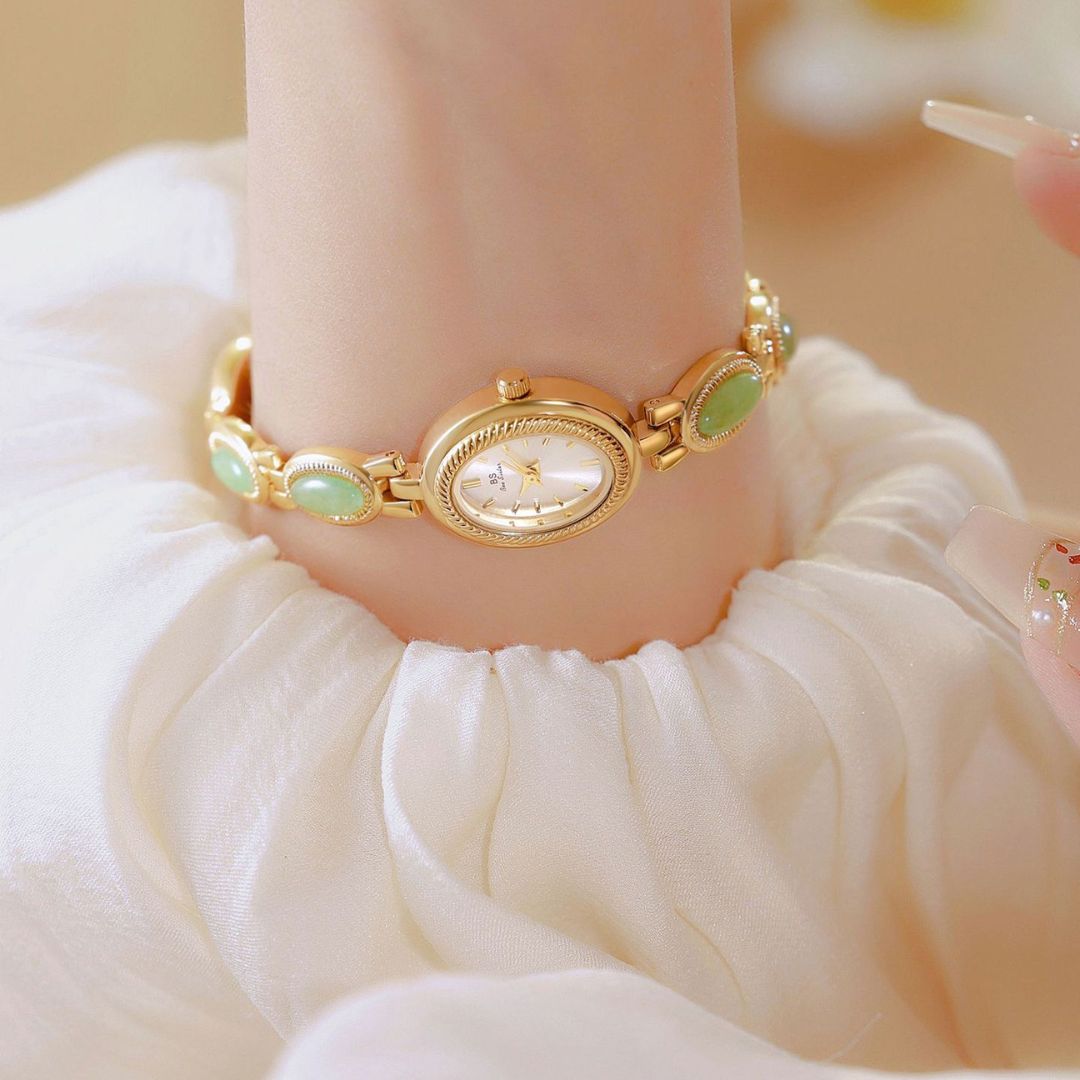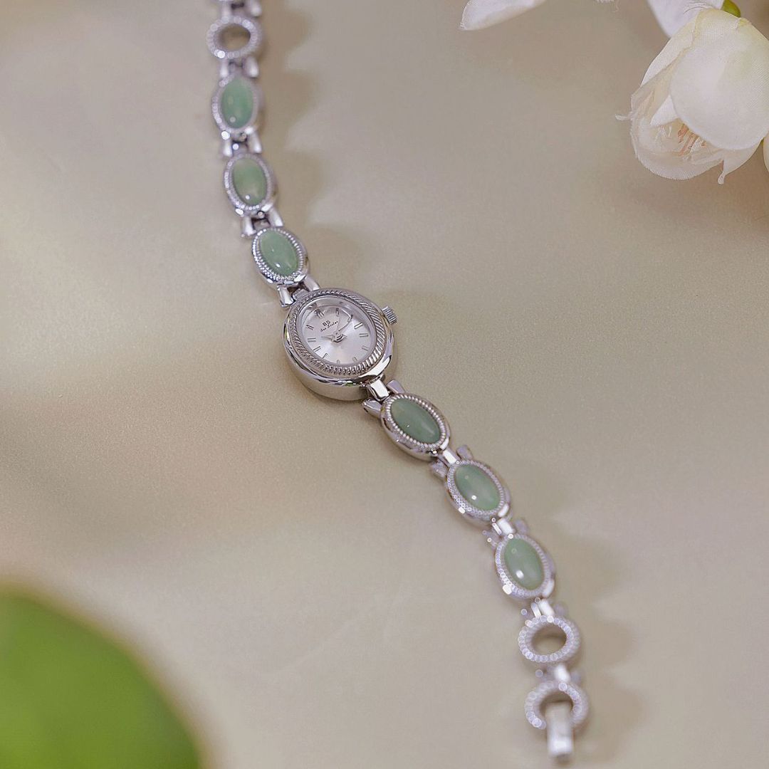 Com seu design elegante e os detalhes em jade, este relógio não é apenas um acessório funcional, mas uma peça de joalheria que atrai olhares admirados. Ele combina perfeitamente com qualquer look, adicionando um toque de classe e elegância discreta, ideal para a mulher moderna que valoriza a beleza e a praticidade.